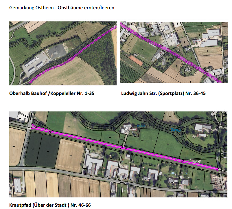 Die Stadt Ostheim v.d.Rhön bietet nachfolgende Obstbäume in der Gemarkung Ostheim v.d.Rhön zur Ernte gegen Entgelt an. Bitte informieren Sie uns vorab, welche Bäume Sie ernten möchten (Nummer steht auf dem Baumstamm) und zahlen Sie nach der Ernte zwischen 5,- und 10,- € pro Baum, je nach Ernteertrag.