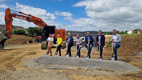 Am 04.06.2024 war offizieller Spatenstich auf der Baustelle. Neben der ausführenden Firma Stolz aus Hammelburg waren der Planer, das Tiefbautechnische Büro Köhl aus Fulda, die Bayerngrund GmbH, die Sparkasse Bad Neustadt und Bürgermeister Steffen Malzer für die Stadt Ostheim vor Ort.