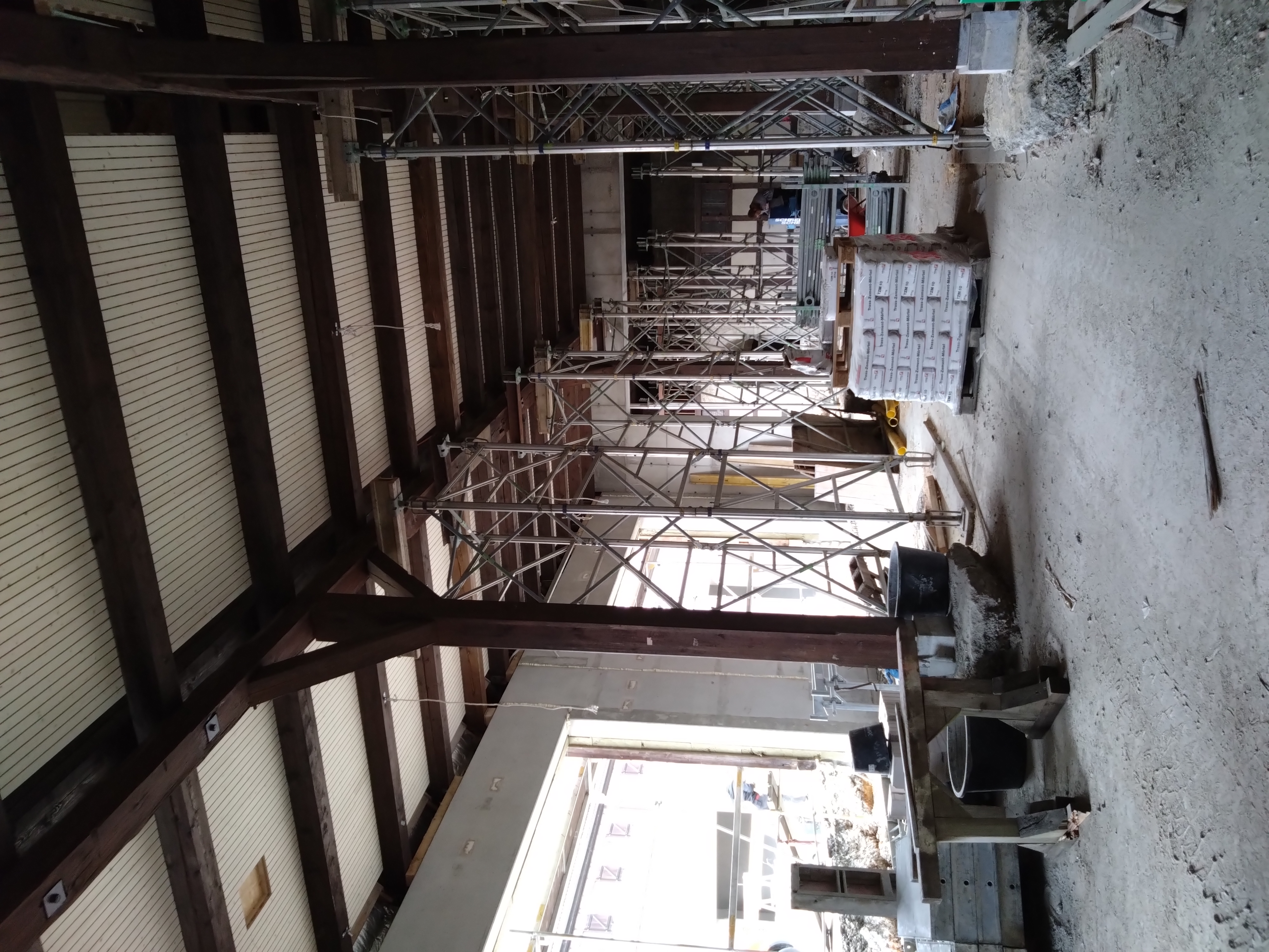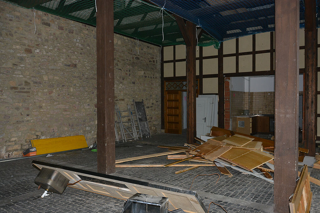 Die Rückbauarbeiten der Markthalle schreiten voran. Gerade wird die Küche ausgebaut und entkernt, ebenso wie der Kühlraum und die Toilettenanlage. Die Mitarbeiter der Firma Hartmann packen hier kräftig an. Nach diesen Arbeiten wird im Hallenbereich der Boden teilweise rückgebaut. Hier entstehen Fundamente für das Abfanggerüst.