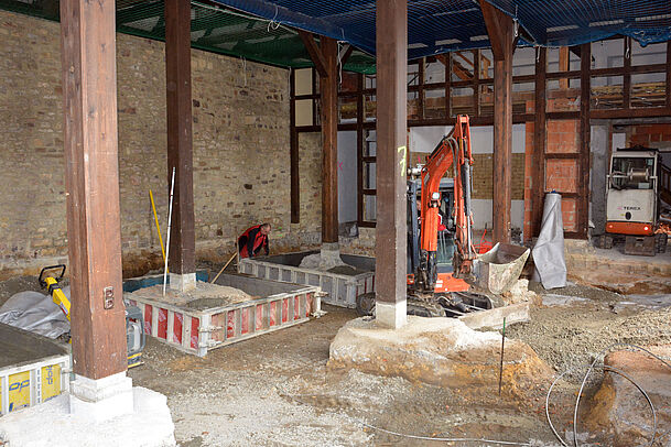 Beim Umbau der Markthalle geht es mit großen Schritten vorwärts. Die Stützfundamente sind schon freigelegt und verstärkt worden. Der Unterbau der neuen Bodenplatten in der Halle ist in Arbeit. Außerdem wird das Gebäude weiter entkernt.