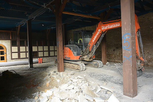 Ein imposanter Bagger entfernt in der Markthalle gerade den Boden, der Abraum wird abtransportiert.