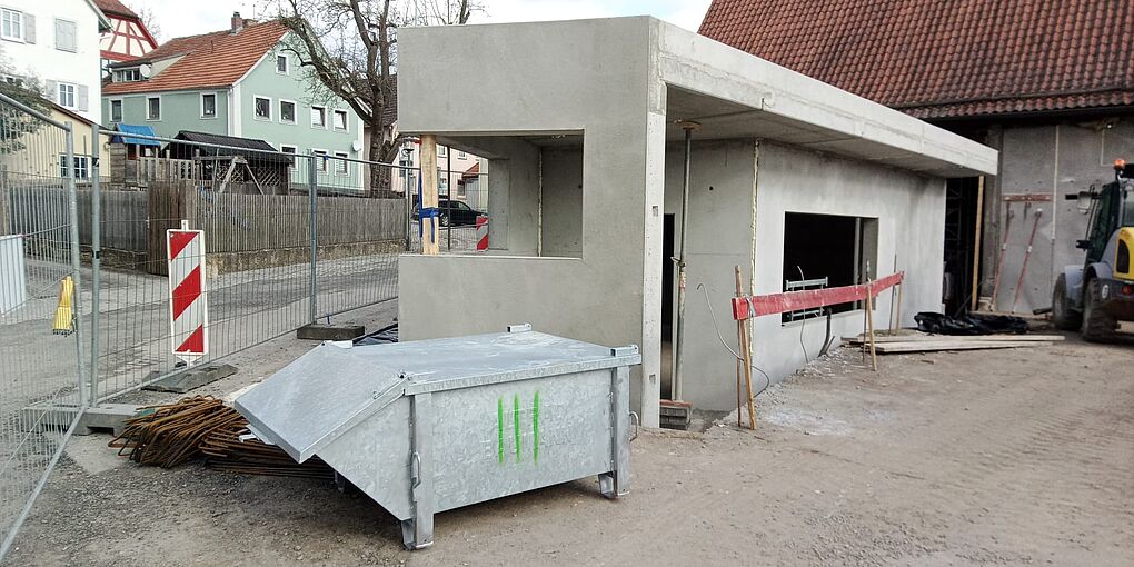 Bei der Umgestaltung der Markhalle geht es gut voran. Im Außenbereich ist schon die Bodenplatte für den Servicepoint entstanden. Die Wände in Richtung Kirchstraße werden verschalt und betoniert. Dass die Türöffnungen entstehen können wurde die Außenwand komplett geöffnet.