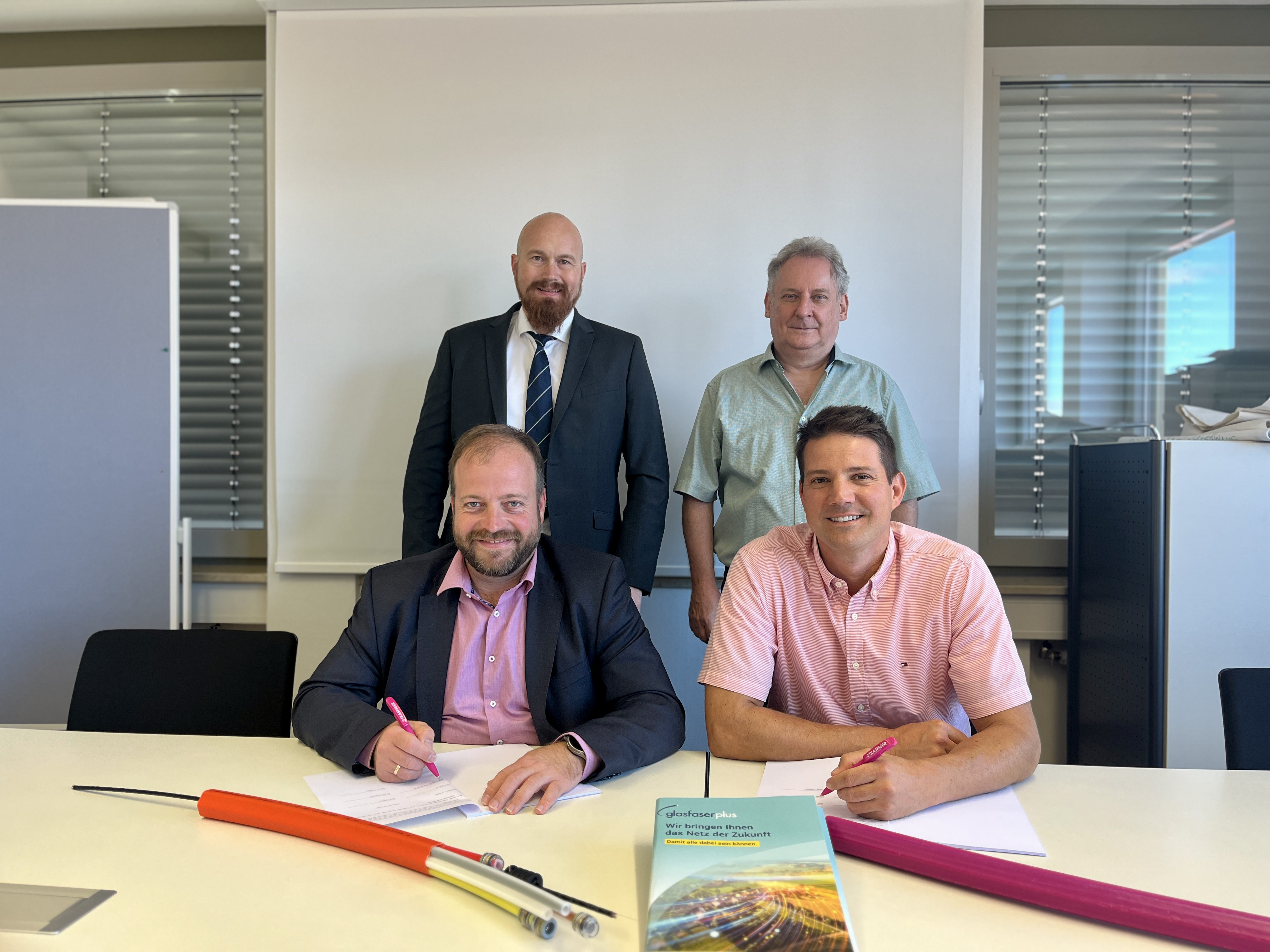 Bildunterschrift: Über den Abschluss des Ausbauvertrages für den finalen Bauabschnitt im Ortsgebiet der Stadt Ostheim v. d. Rhön freuen sich (vordere Reihe von links): Steffen Malzer (1. Bürgermeister der Stadt Ostheim v. d. Rhön) und Thomas Andreas Hofmann (Deutsche Telekom Technik GmbH / GlasfaserPlus GmbH) sowie (hintere Reihe von links) Frank Reichert (Landkreis Rhön-Grabfeld | Kreisentwicklung) und Günther Pichlmaier (Corwese GmbH) Foto: Christian Hüther | Landkreis Rhön-Grabfeld