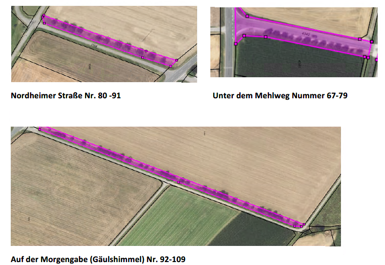 Die Stadt Ostheim v.d.Rhön bietet nachfolgende Obstbäume in der Gemarkung Ostheim v.d.Rhön zur Ernte gegen Entgelt an. Bitte informieren Sie uns vorab, welche Bäume Sie ernten möchten (Nummer steht auf dem Baumstamm) und zahlen Sie nach der Ernte zwischen 5,- und 10,- € pro Baum, je nach Ernteertrag.