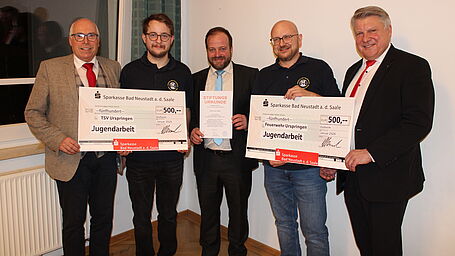 Die Stiftungsurkunde wurde im Rahmen der Jahresabschlussitzung am 09.01.2026 offiziell an Ersten Bürgermeister Malzer von den Vorständen der Sparkasse Bad Neustadt a.d.Saale übergeben. Weiterhin wurden jeweils 500 Euro an die Freiwillige Feuerwehr Urspringen sowie an den TSV Urspringen für die Jugendarbeit übergeben, wie man auf dem Bild erkennen kann.